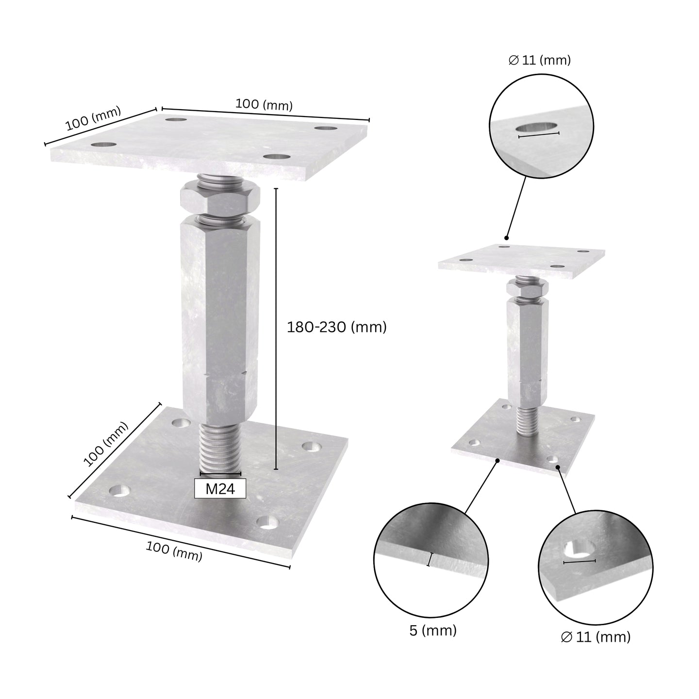 VERSATILIDAD - Para estabilidad, se requiere un rango de ajuste de aproximadamente 10 a 20 mm para la seguridad de la rosca, y la galvanización asegura que el soporte de poste esté protegido contra influencias externas del clima.
