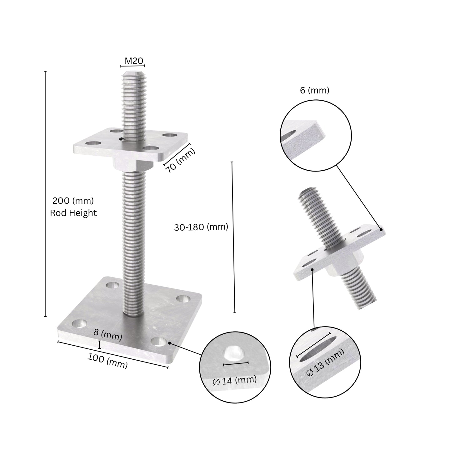 VERSATILIDAD - Por razones de estabilidad, se requiere un rango de ajuste de aproximadamente 10 a 20 mm como seguridad del hilo. Gracias a la galvanización en caliente, el soporte de poste elevado ajustable está perfectamente protegido contra las influencias climáticas externas. La placa base mide 70 x 70 mm y la placa de soporte mide 50 x 50 mm.